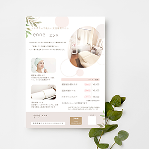 サロンOPENの宣伝のために依頼しました。何パターンか選べるようにしてもらってた事と、自分の好みを理解してもらえた事で、スムーズに進めることができました。イベント出店の際に活用させてもらい、内装の写真も載せてもらったので、サロンの雰囲気が伝わってよかったです。エステサロンらしく、清潔感のあるデザインで好評でした。